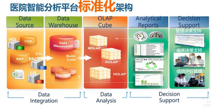 星捷安智慧医疗大数据平台基于现有医院信息系统数据,运用大数据存储、计算、可视化相关技术进行平台的搭建,与Hadoop无缝对接,可实现对医院业务、卫生业务进行全面的分析及预测,平台的主要目的是促使医院在信息系统的建设上实现对业务流程支持的同时,迅速准确地从日益膨胀的业务数据中获取患者、库存、医院的运营状况等高层次的分析决策信息,以直观的方式,从多个角度为医院决策者提供量化的决策依据,提高医院决策的准确率,从而提高医院的整体效益。这也是将医院的数据变为信息,再将信息变为知识的过程。商业智能是下列五类工具的集合: