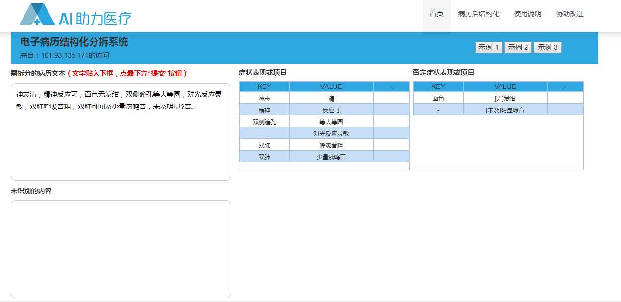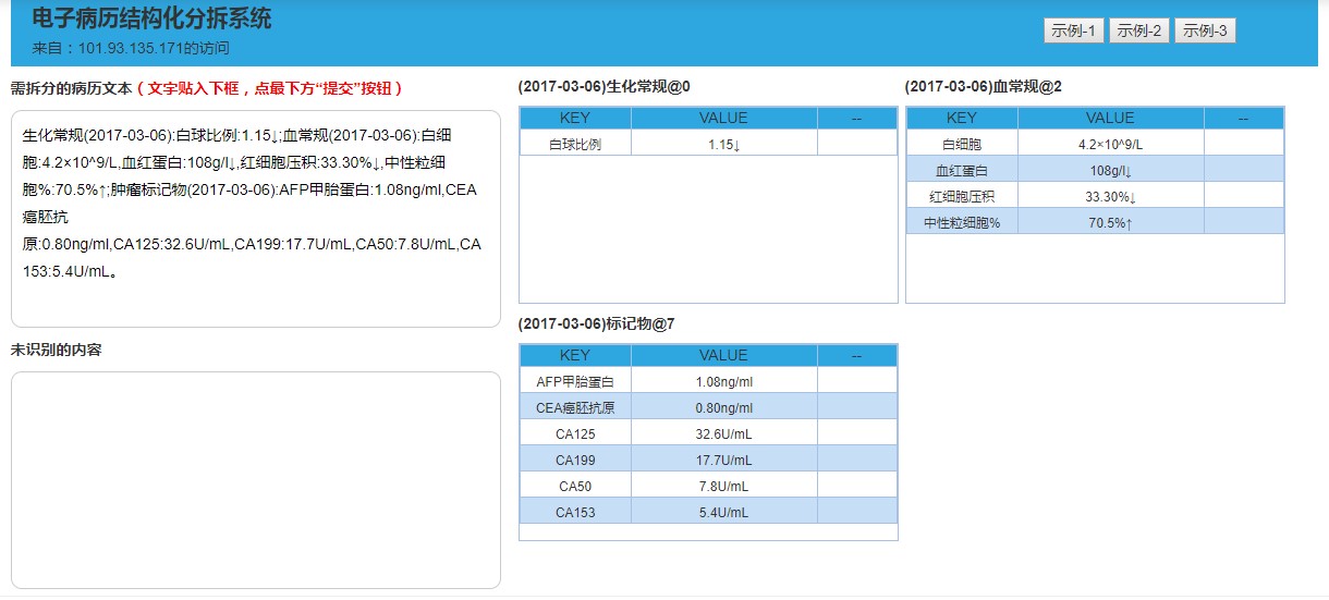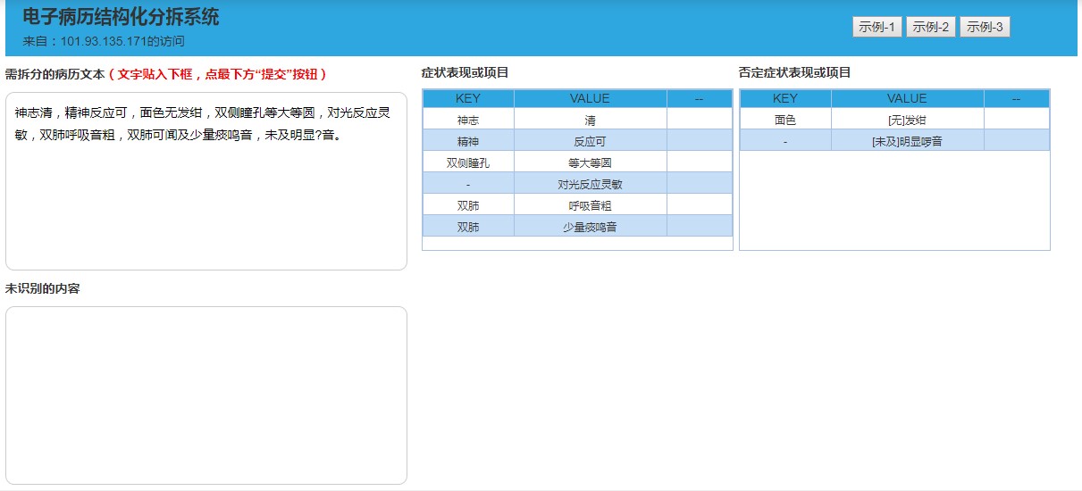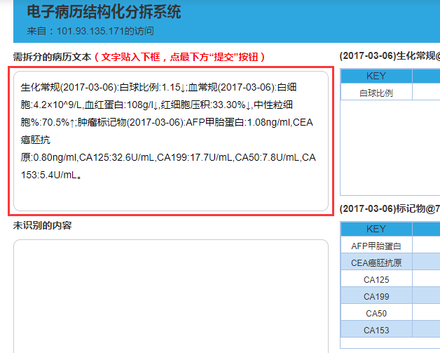 在系统界面汇总输入病历文档,点击提交按钮,得到以下解析结果: