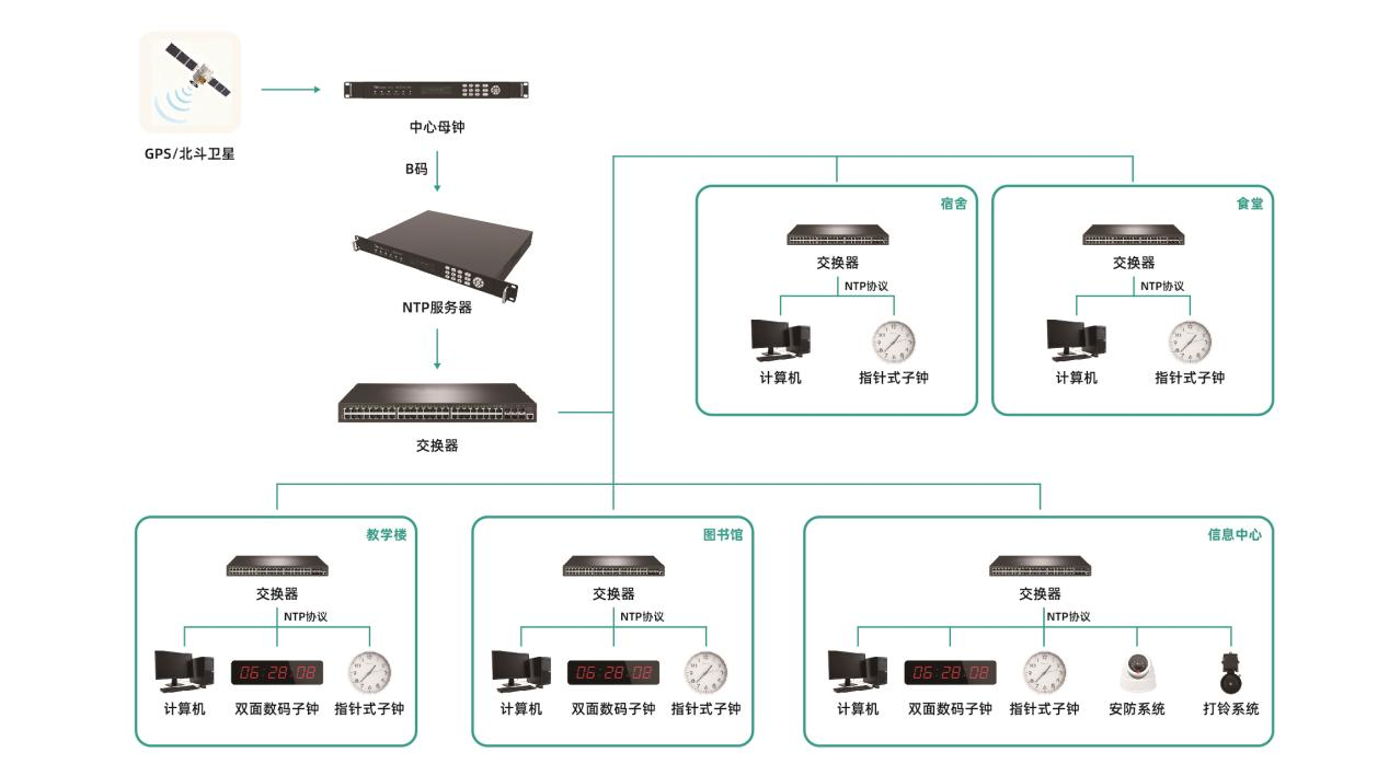 作为连续多年服务全国高考、中考、学业水平考试等重大国家级考试的技术服务商,全视通标准化考场时钟同步系统由时钟显示、传输控制、现场网络部分。时钟显示:时钟的显示格式和面板可定制,显示材质可分为数码管显示、指针显示,时间格式可分为时分、时分秒、时钟万年历等;传输控制:传输控制包括中心母钟,NTP服务器, 时码分配器(转为RS232/RS485)、客户端电脑、授时管理软件等;现场网络:组成部分之间的通讯方式,可以是标准工业RS485、TCP/IP 等。