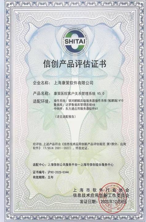 近日,上海康策软件有限公司传来喜讯,其旗下自主研发的核心产品—医院客户关系管理系统V5.0(KHCRM),成功荣获上海软件行业协会信息技术应用创新工作委员会颁发的「信创产品评估证书」,同时康策软件正式成为该工作委员会成员单位。