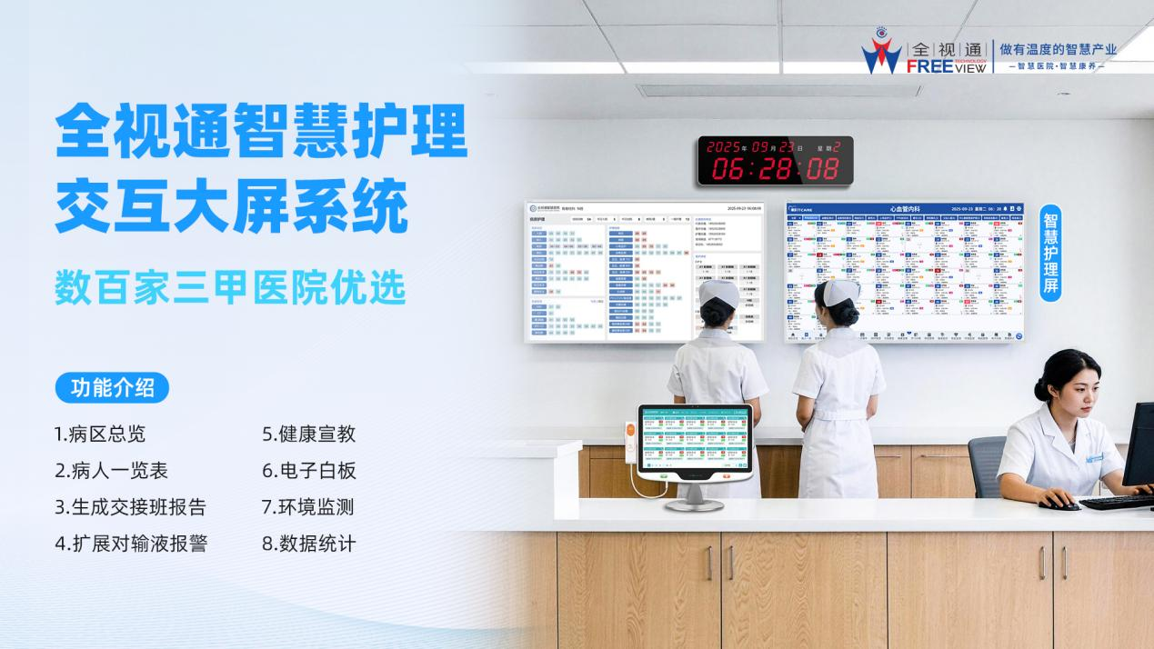 作为智慧医院建设的重要组成部分,智慧护理交互大屏系统正逐步成为各大医院护士站的“数字中枢”。传统护理工作站常面临信息分散、操作繁琐、交接班效率低、安全隐患多等挑战,正悄然影响着护理效率与患者体验。全视通智慧护理交互大屏系统通过深度对接医院HIS、LIS、PACS等核心信息系统,有效填补了传统护理信息化的空白,将原本分散在多个系统中的数据统一整合,实现患者数据的自动采集、智能整合与可视化呈现,平均可减少护士非直接护理时间,让护士回归临床,真正践行“以患者为中心”的服务理念。