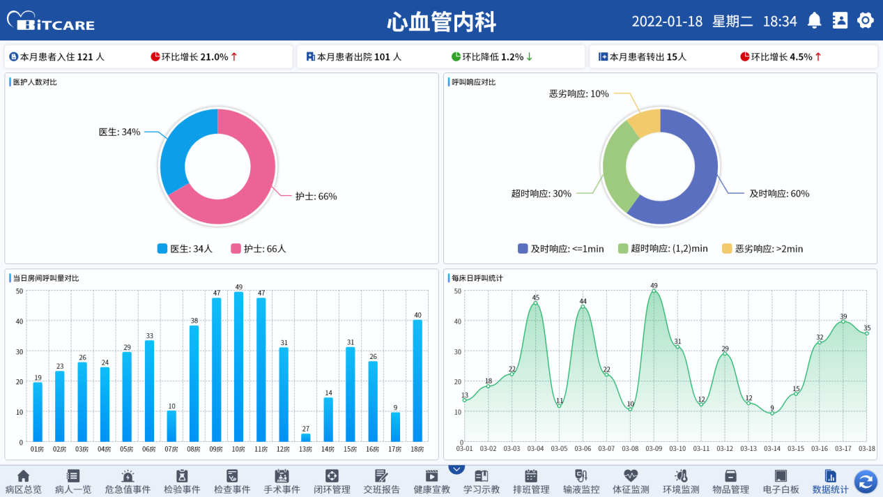 7、数据统计分析:智慧护理交互大屏系统医院患者概况、预测患者住院趋势,以各种图表的形式进行展示护理数据,方便统计分析,辅助科学决策。