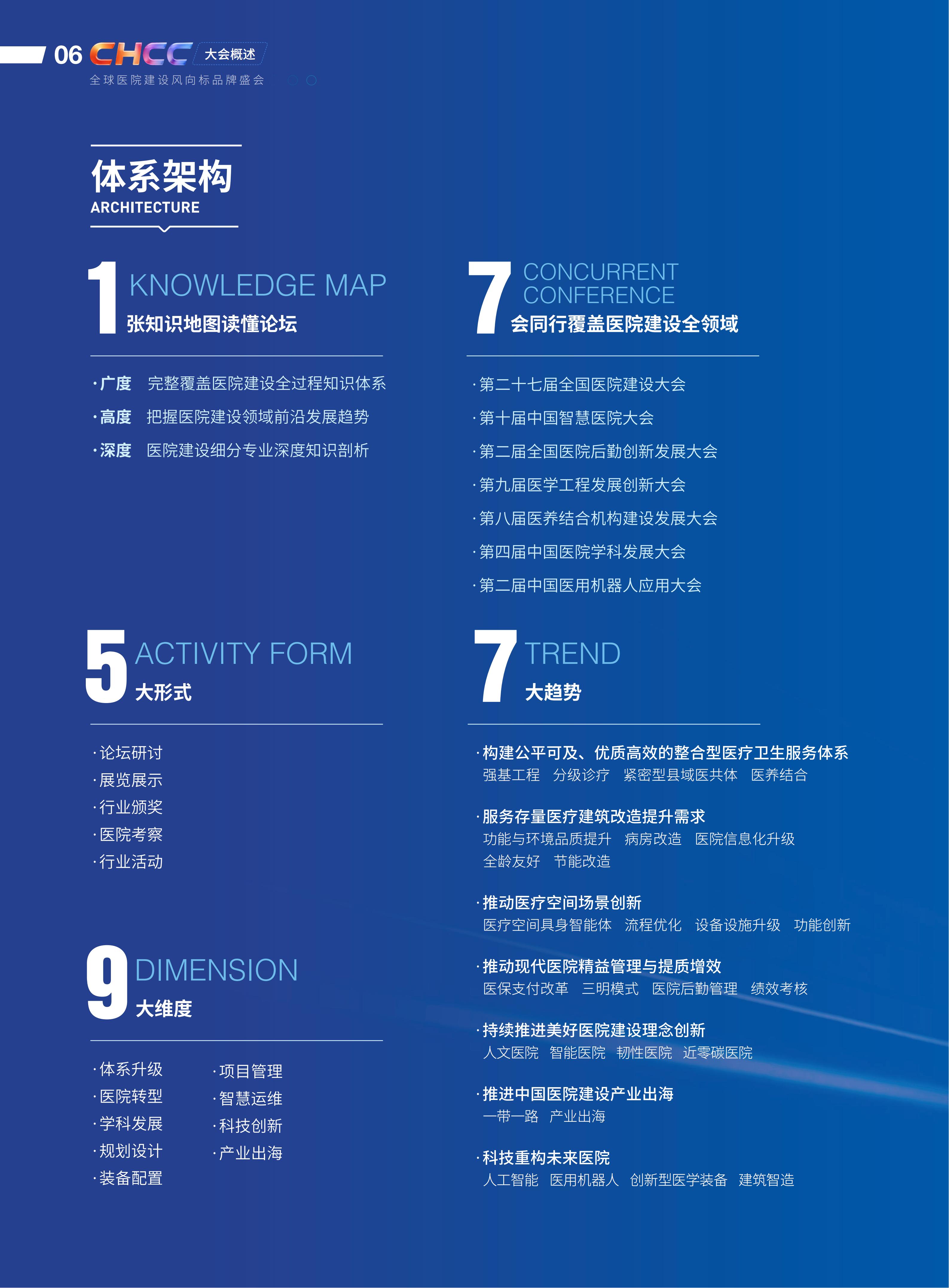 本届大会与“第十届中国智慧医院大会”“第二届全国医院后勤创新发展大会”“第九届医学工程发展创新大会”第八届全国医养结合机构建设发展大会”“第四届中国医院学科发展大会”“第二届中国医用机器人应用大会”七会同行,设置100余场不同方向的专题论坛,邀请国内外行业领导、顶级专家学者和高级管理者万余人,围绕体系升级、医院转型、学科发展、规划设计、装备配置、项目管理、智慧运维、科技创新、产业出海等多层次、多维度深度交流探计。