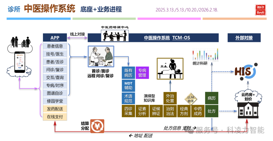 中医操作系统(TCM-OS),是一套可解释、可追溯、可验证的独立系统,向上提供多种临床服务进程(教学/诊疗/科研/传承/标准/健康/运营/管理/转化),向下管理演绎型语义知识库等。