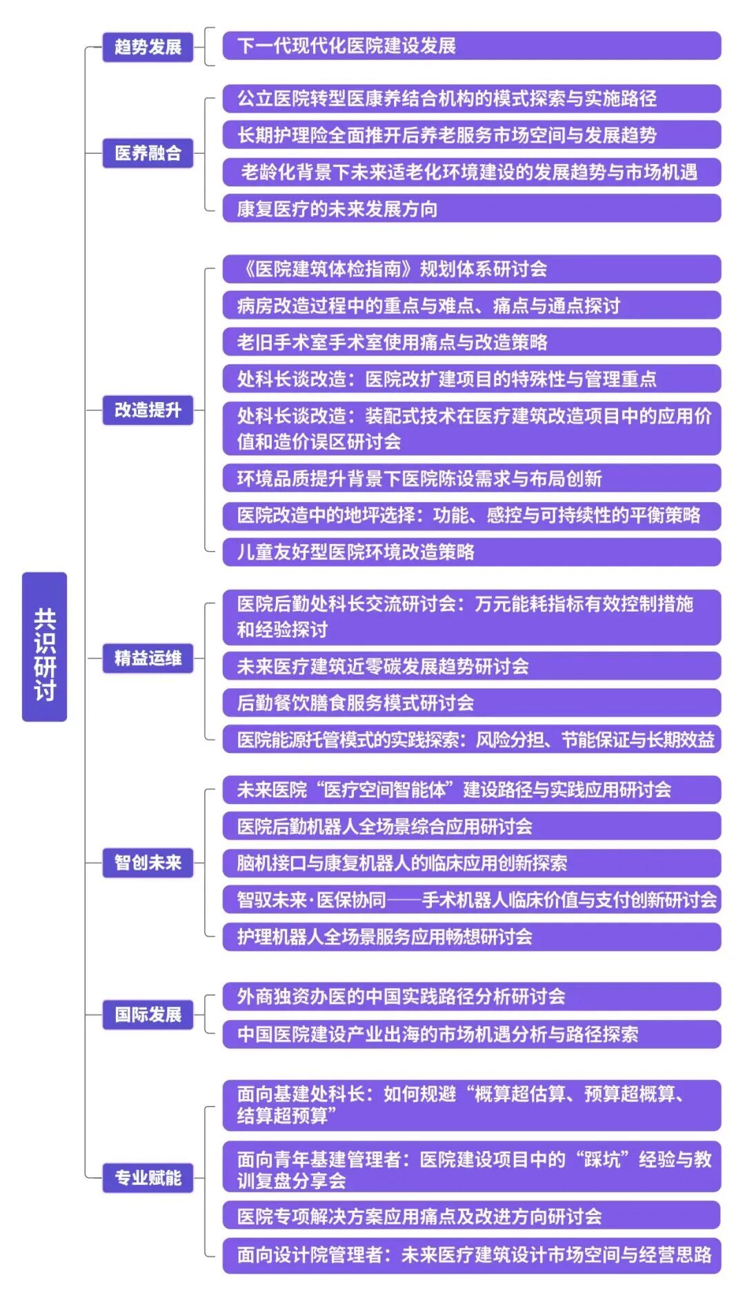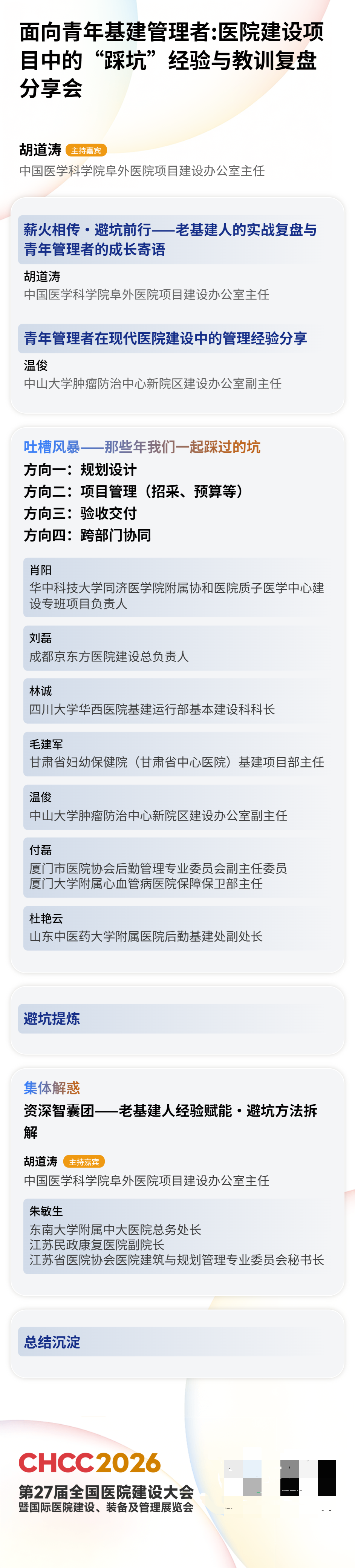 01、规划设计 如何避免前期设计不合理,导致后期反复整改? 02、项目管理 招采、预算、进度怎么管,才能不超支、不延期? 03、验收交付 关键节点如何把控,杜绝交付后出现质量隐患? 04、跨部门协同 怎么打通临床、行政、后勤,让项目推进一路顺畅? 现场更有 “吐槽风暴” 环节,让你把平时不敢说的难题、踩过的坑,一次性说透,和一群同频的基建人一起,找答案、解心结,快乐避坑! CHCC2026共识研讨List