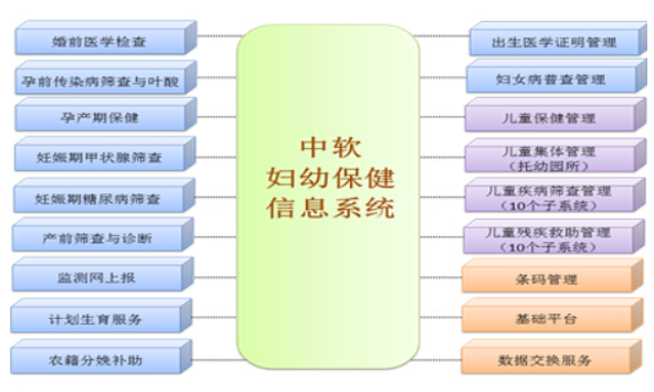 系统主要功能包括婚前医学检查、孕前传染病筛查及叶酸补服、孕产期保健管理、产前筛查管理、妇女病普查管理、出生医学证明管理、儿童保健管理、儿童集体管理、儿童疾病筛查管理、儿童残疾救助管理等36个子系统。