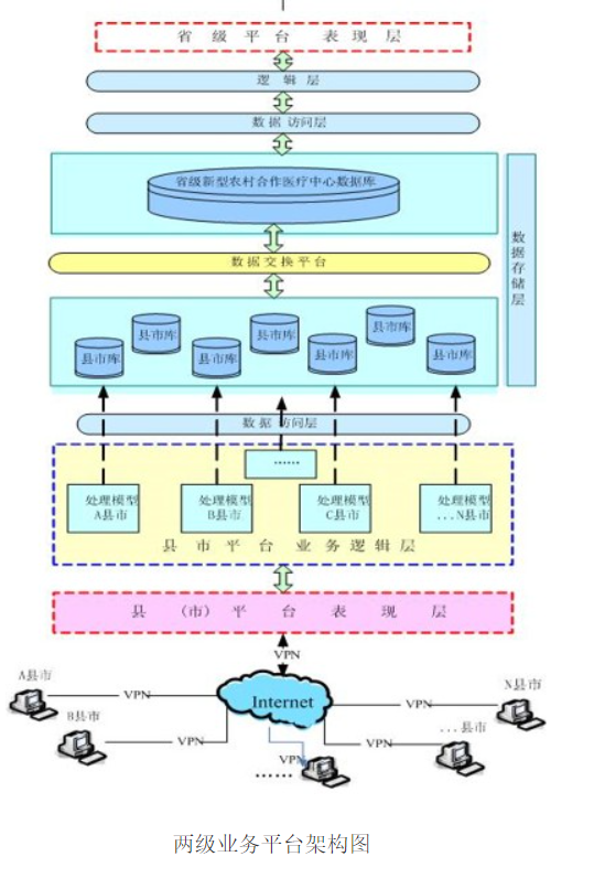 业务平台基于卫生部《新型农村合作医疗信息系统基本规范》,系统功能实现以县(市)业务系统为基础,以资金的管理为核心,以合作医疗基金的筹集、审核补偿、补偿发放为业务主线,在县(市)业务平台的基础上通过数据交换平台,将县(市)业务数据同步到省级中心数据库,建立省级的新农合基金监控的数据分析平台。