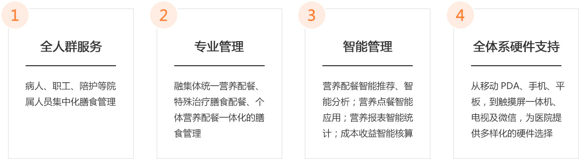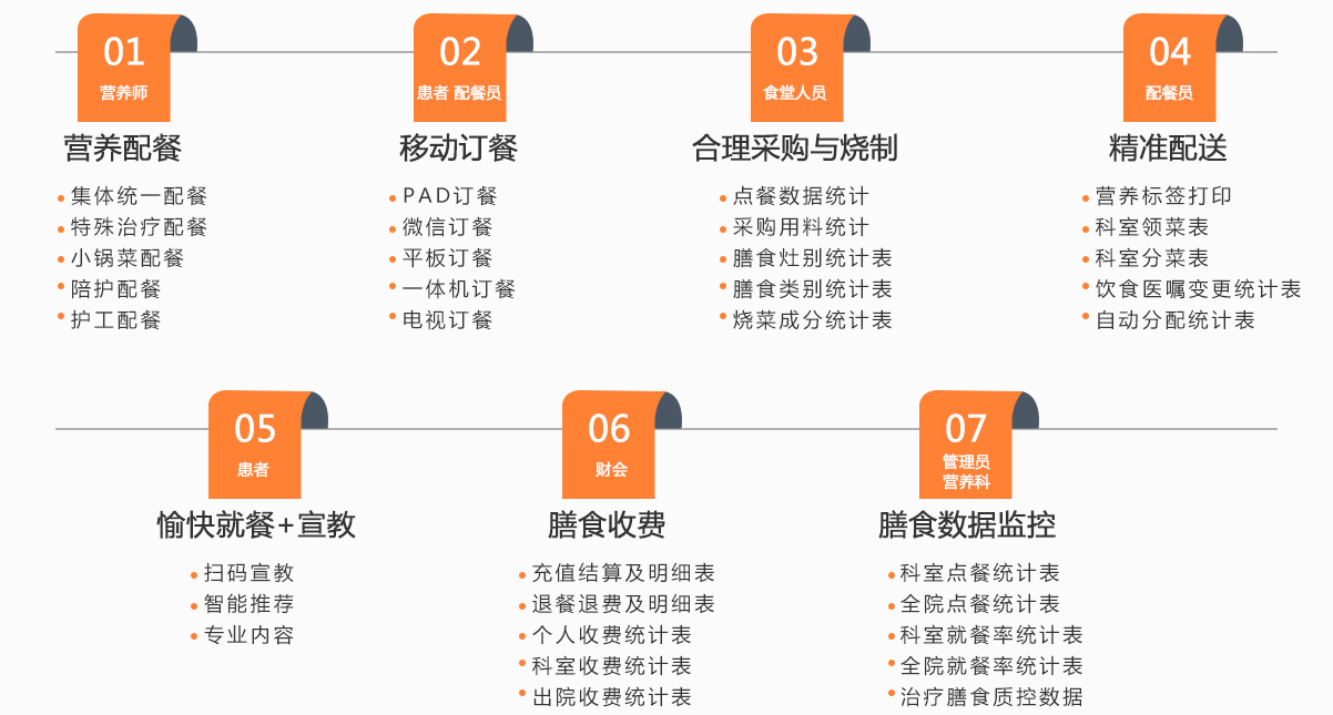 医院营养膳食管理系统,是以医院信息平台为数据基础,以提高膳食管理效率为基本着力点, 以营养膳食专业化管理为核心竞争力, 通过多样化膳食管理模式的有效整合,构建完整的营养配餐、点餐、备餐、分餐、采购、收费管理流程体系, 为住院患者和院属职工提供专业的、 全面的营养膳食管理服务,最终实现满意度的全面提升。