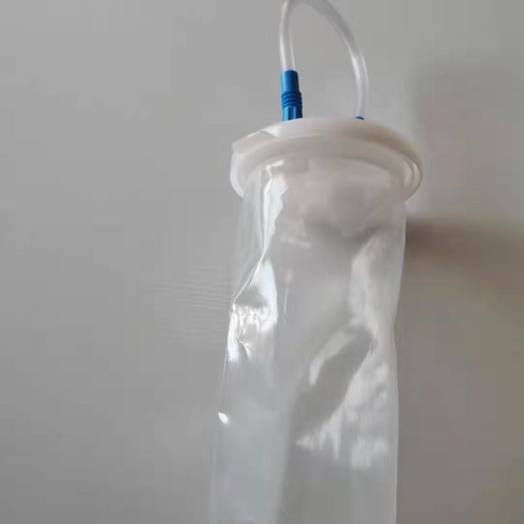 手术室医疗废液收集装置,引液袋上盖的软管采用高弹性材质(医用聚氯乙烯)不易出现折管现象更易恢复原状,从而避免吸力减弱或无吸力现象,软管与盖帽之间采用无胶装配,无毒挥发气体,病人端口采用波浪圈,确保紧密扣合,不脱落。