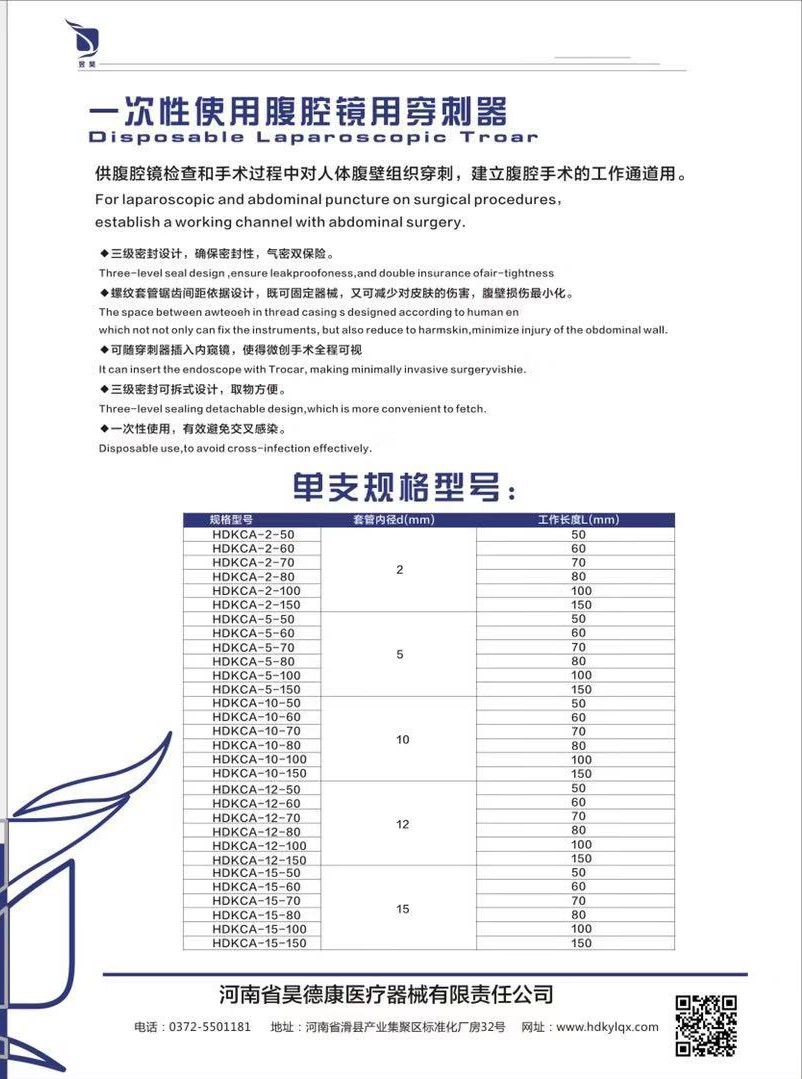 供腹腔镜检查和手术过程中www.hnyuenai.com对人体腹壁组织穿刺,建立腹腔手术的工作通道用。