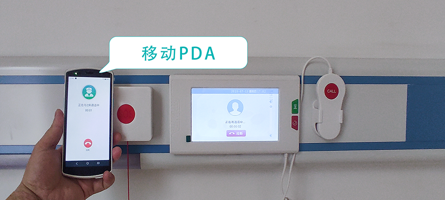 长者床头配置有智能护理床分机,长者可通过呼叫手柄与医护人员进行通话。除康养管理主机外,医护人员也可以在移动PDA上接收呼叫信息,以实现语音通话,及时响应长者的需求。与此同时,智能护理床分机还能与机构养老管理系统实现数据联动,展现长者的基本资料、病史、过敏源、护理级别、费用清单等信息。