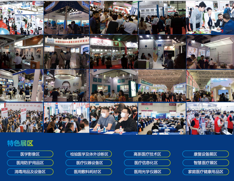 医学影像/医疗电子仪器设备展区,骨科/医用敷料耗材展区,临床检验IVD体外诊断展区,智慧健康/康复养老设备/家用医疗健康展区,医疗设计与制造配件/制造机械展区,消毒感控/医院建设及后勤装备管理展区,手术室/医用光学/医疗机器人展区/教学类;