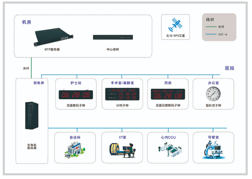 全视通子母钟系统概述 医院时钟系统主要为全医院提供统一的精准同步时间,其主要作用是为整个医院的计算机系统及呼叫系统、BA系统、手术室控制系统以及其它弱电子系统提供标准的时间源。 精准统一的时间标准,可以给护士站的工作人员为特护病人、重症观察患者提供及时、精确的护理时间参考,为麻醉室、手术室、供氧呼吸系统、实验室等提供精准的时标数据;有了智能型子母钟系统以后就不再需要人工看表来计时了,子母钟系统自带的正计时和倒计时、温度湿度显示功能能提供精确的数据参考,考虑到大型医院的战备常用,在医院的人防工程中设置子母钟系统也可以保证战时医院的各部门协调统一运作。#时钟系统##时钟同步系统##时钟##标准时钟# #全视通同步时钟系统