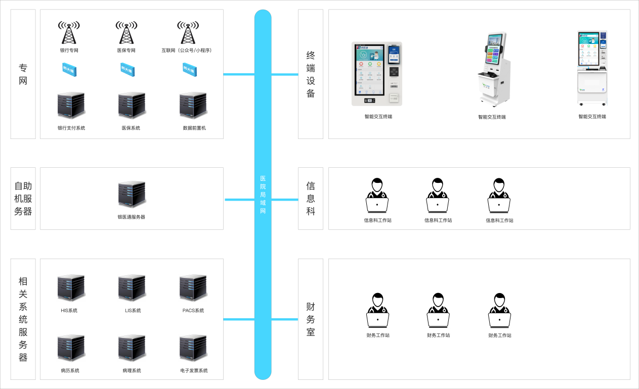 凭借卓越的产品方案及服务,在众多医院服务厂商中脱颖而出,全视通已经连续三年荣膺“中国医院建设十佳供应商”称号。银医通自助服务管理系统作为十佳品牌全视通的热销产品,由银医通自助缴费、挂号、报告打印、发票打印、结算等终端与自助服务管理系统两大核心模块构成。系统主要功能包含:自助建档、当日挂号、预约挂号、义诊挂号、一号管三天、门诊缴费(含检验、检查、药品)、检查预约 、检验/检查/治疗自助开单、入院办理、出院结算、检验报告打印、检查报告打印、凭条补打、病理报告打印、病历报告打印、门诊电子发票打印、住院电子发票打印、住院费用记录查询、医生排班查询、医生信息查询、医保政策展示及健康宣教、物价查询、微信支付、支付宝支付、银行卡支付、医保刷脸支付,真正实现“让数据多跑路,让群众少跑腿”。