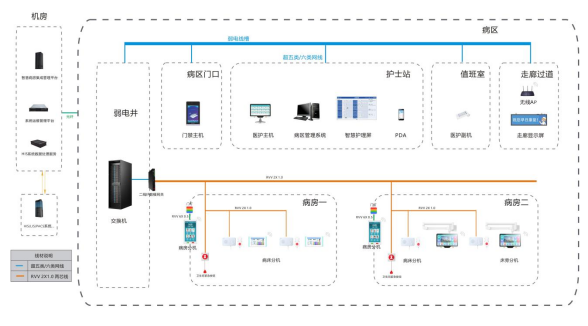 智慧病房系统由多个部分组成,医院可根据自身规模、信息化水平、投资预算等因素,选用不同系统架构和配置设备。本系统采用基于无线 + 二线(线路利旧)架构的智慧病房系统,实现病房智能化管理。
