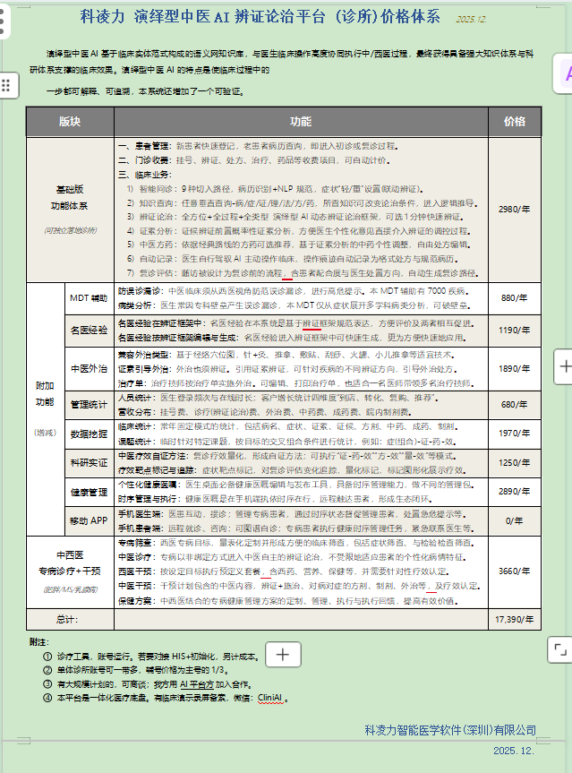 公司主力产品--演绎型中医AI平台,具备演绎型+逻辑型优势,核心是“临床实体范式”和“语义网知识库”,模拟医生的逻辑推导过程(可解释、可追溯),直击“AI黑箱”痛点,更具临床严谨性。在2024年四川省卫生信息学会获评人工智能在医疗领域的应用“2024年度医疗信息化应用典型案例”优秀案例,欢迎同仁咨询、了解!