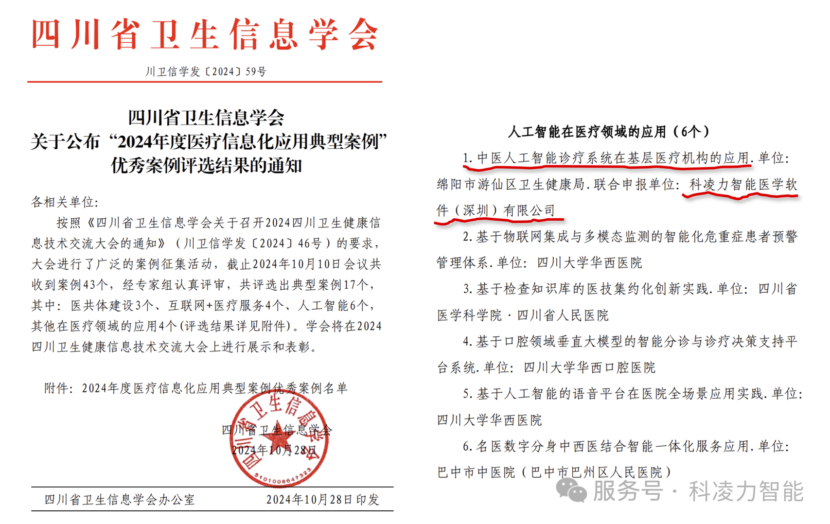 在历经案例征集、专家评审等严格环节后,由绵阳市游仙区卫生健康局牵头、科凌力智能医学软件(深圳)有限公司联合申报的项目——“中医人工智能诊疗系统在基层医疗机构的应用”从全省43个参评案例中脱颖而出,成功入选“人工智能在医疗领域的应用”类别优秀案例名单!
