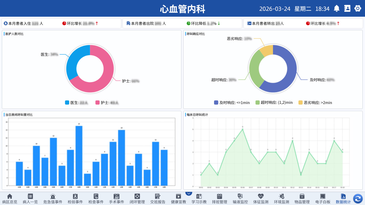 多维度统计分析病区数据,预测患者住院趋势,以各种图表的形式进行展示护理数据,方便统计分析,为人力资源调配、耗材管理及学科建设提供强有力的数据支撑,辅助管理者做出科学决策。